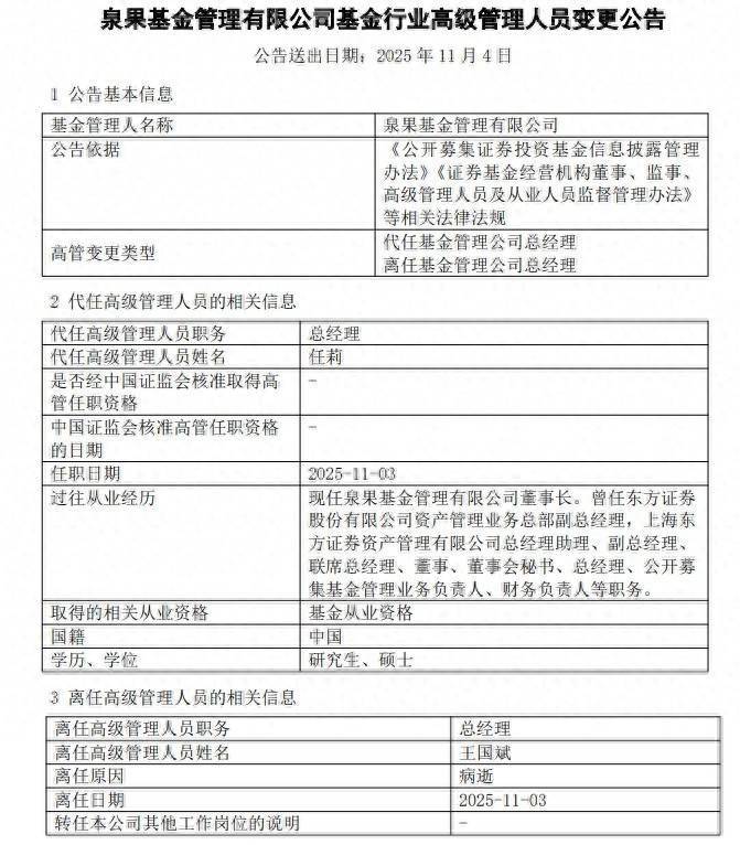 智通财经APP获悉,11月3日,泉果基金发布公告称,总经理王国斌已于当日离任,离任原因为病逝。董事长任莉代任总经理。公告发出后,泉果基金官网已变黑白。