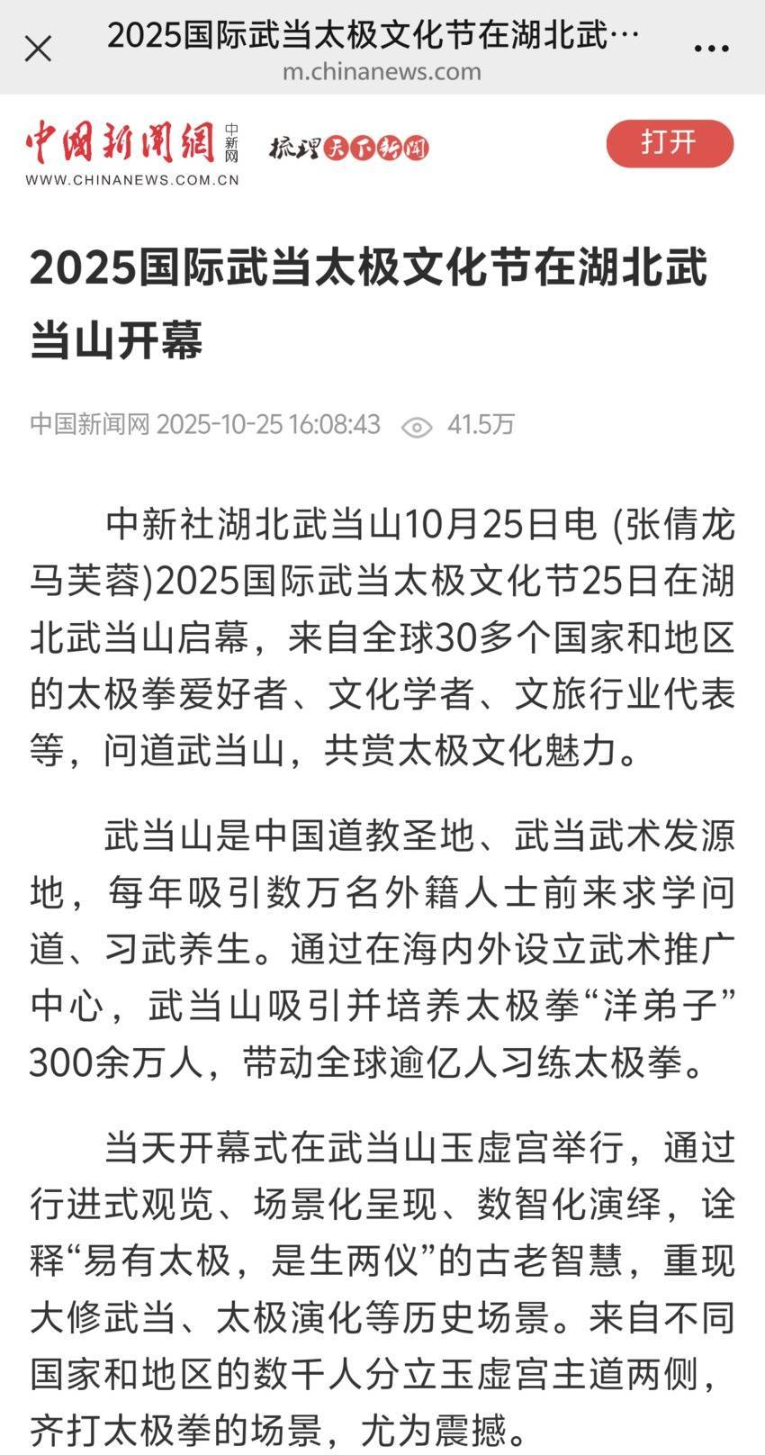 数据是最好的证明:超10亿的总浏览量、超20亿的网络话题参与量,以及仍在攀升的后继影响力,共同铸就了2025国际武当太极文化节宣传推广工作的辉煌丰碑。这不仅是武当山文旅融合的又一次成功实践,更是中国文化自信自强的生动注脚。通过此次文化节,武当太极已然成为一个具有全球影响力的文化IP,正以更加开放、自信的姿态,在世界文化的舞台上,徐徐展开一幅“道法自然、天下太极”的壮丽画卷。