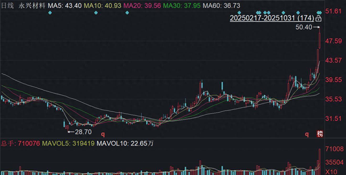 截至10月31日收盘,永兴材料大涨7.29%报49.16元/股,总市值约265.02亿元,今年来公司股价累计上涨超三成。